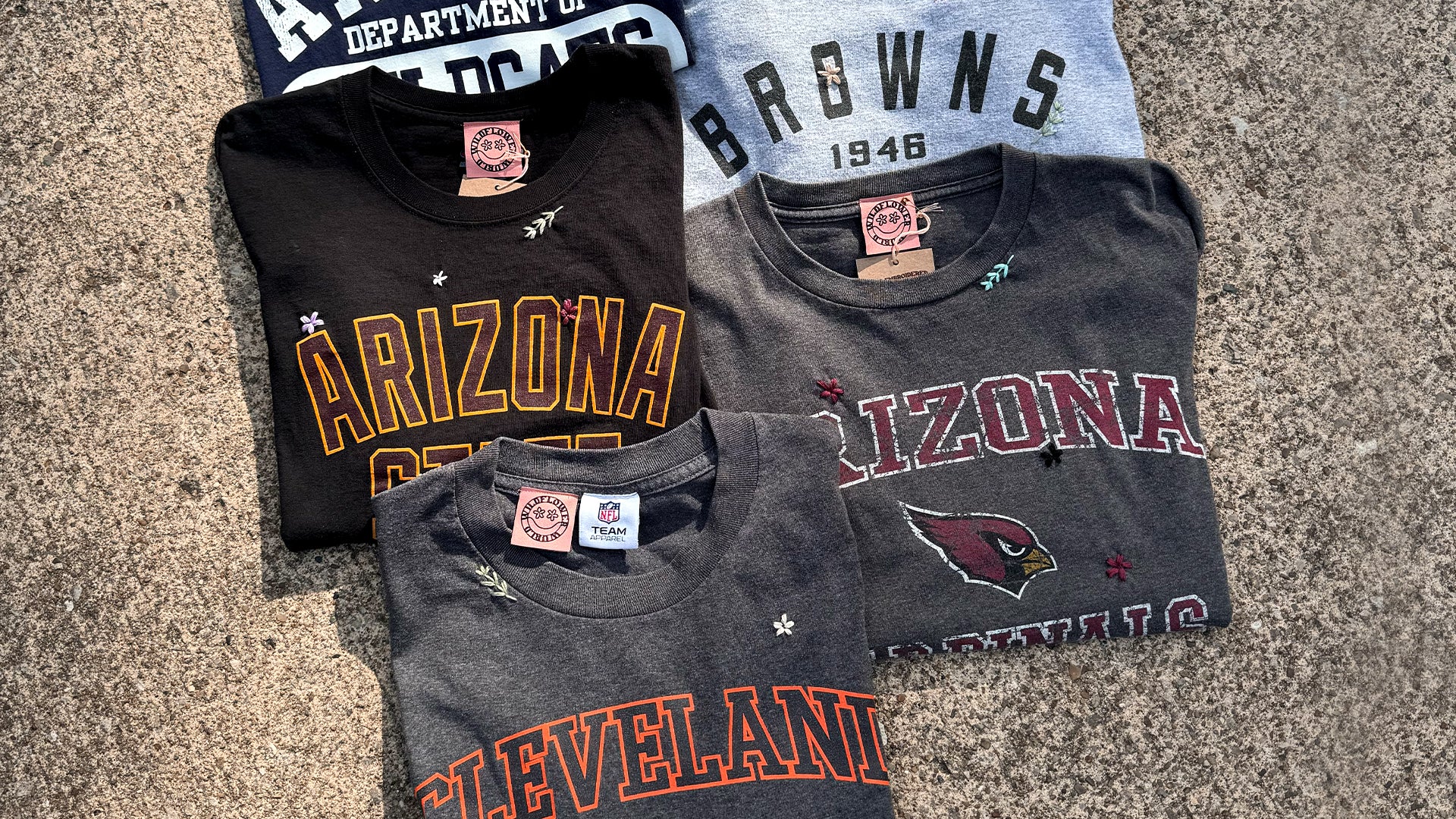 Your favorite team gear and 1-of-1 vintage graphic apparel, decorated with our hand embroidered wildflowers.